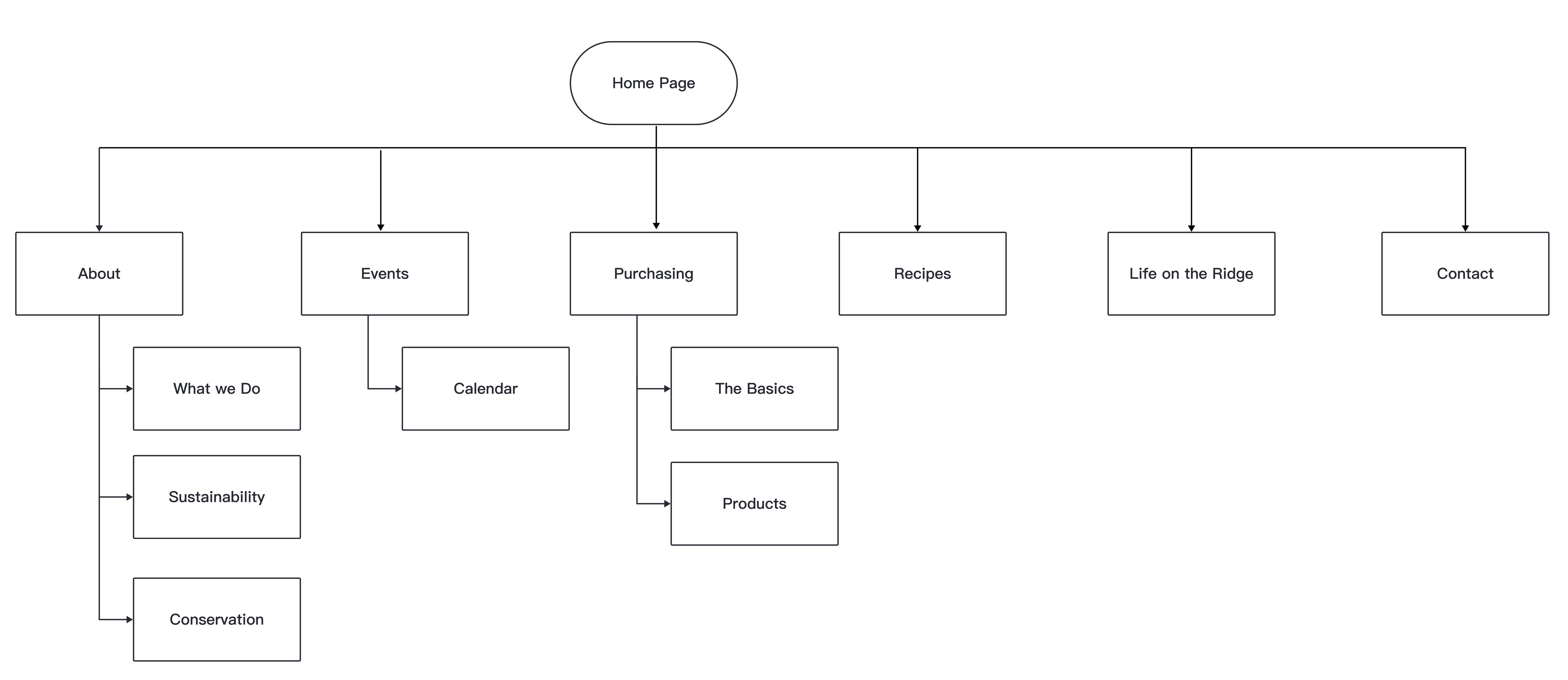 To support our mission of making the farming and sustainability practices of Hampton Ridge Farm front and center we had to adjust our site map and information architecture. This would require removing some information and adjusting the hierarchy over all.