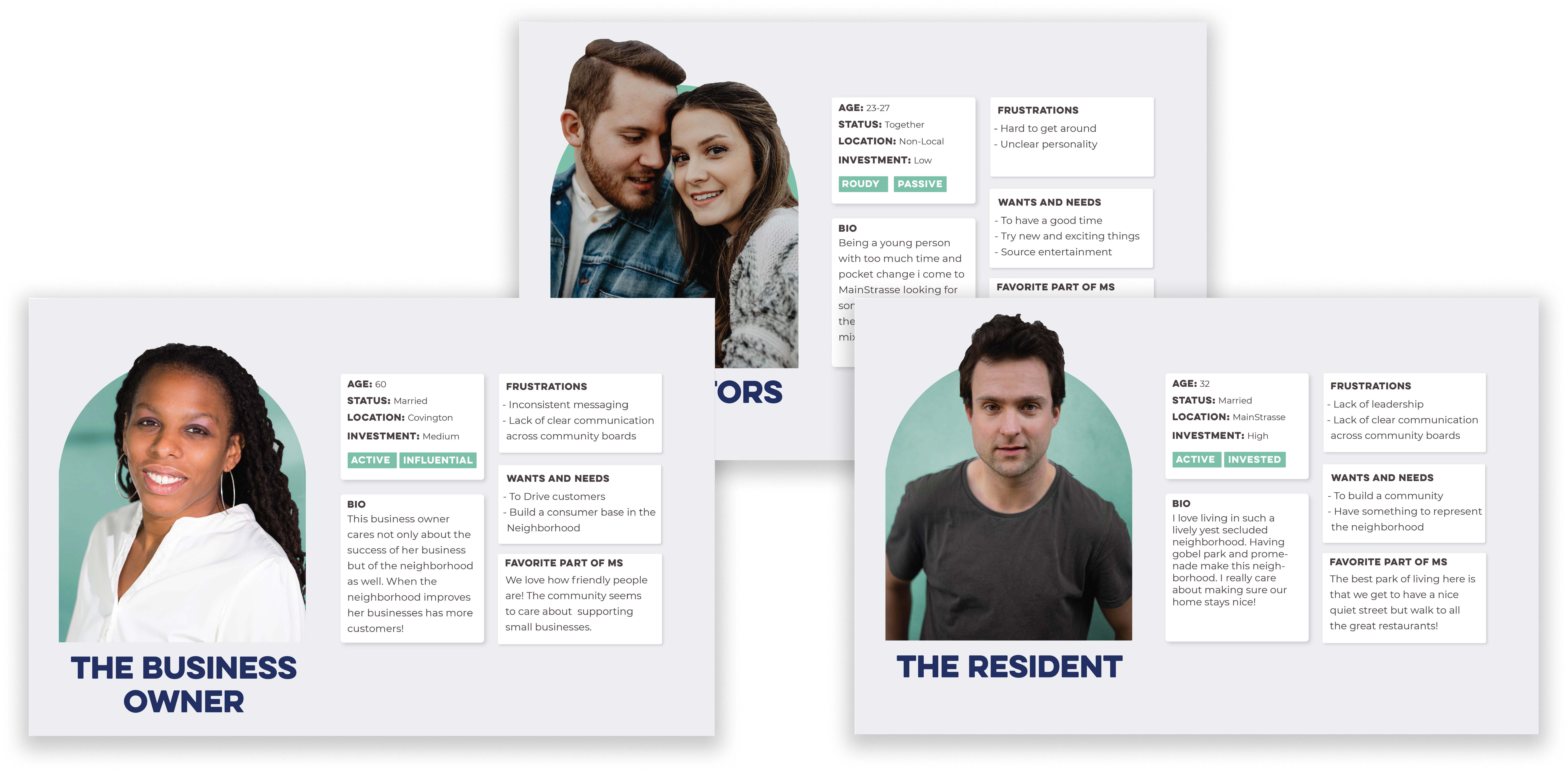 To better understand who we were designnig for and how to get them excited we created three audience personas- The Resident, The Buisness Owners, and The Visitors.